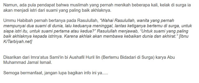 “Begitu juga halnya dengan Ummahatul Mu’minin,” kata Abu Muhammad Jamal dalam buku Imra’atus Sami’in bi Aushafil Huril Iin, “kelak di surga akan menjadi istri-istri Rasulullah, meskipun sebelum dinikahi Rasulullah mereka pernah dinikahi orang lain.”