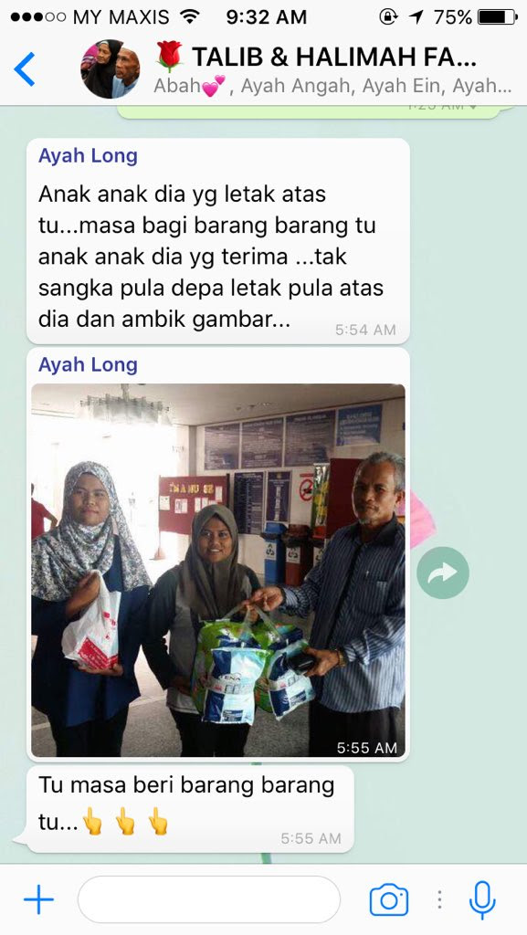 "Anak-anak dia yang letak (barang) atas tu. Masa bagi barang-barang itu, anak-anak dia yang terima. Tak sangka pula depa letak pula di atas dia dan ambil gambar," katanya.