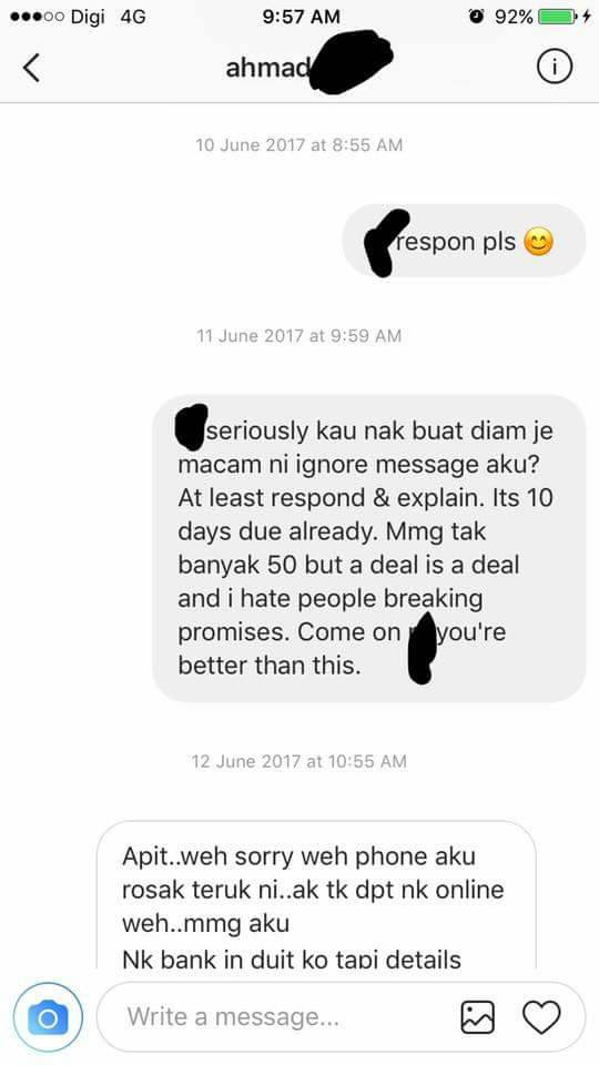 Tetapi nampaknya situasi saya bukanlah seperti yang dijangka. Anda nilailah sendiri dari gambar-gambar perbualan kami di bawah. Saya tak ambil ini sebagai kesilapan, tetapi ini adalah pengalaman berharga yang mengajar saya untuk lebih berhati-hati.