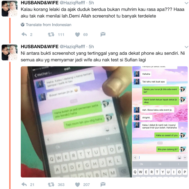 Dalam tweet Haziq itu juga mendakwa Sufian cuba mengajak isterinya menemani dia di hotel semalaman.